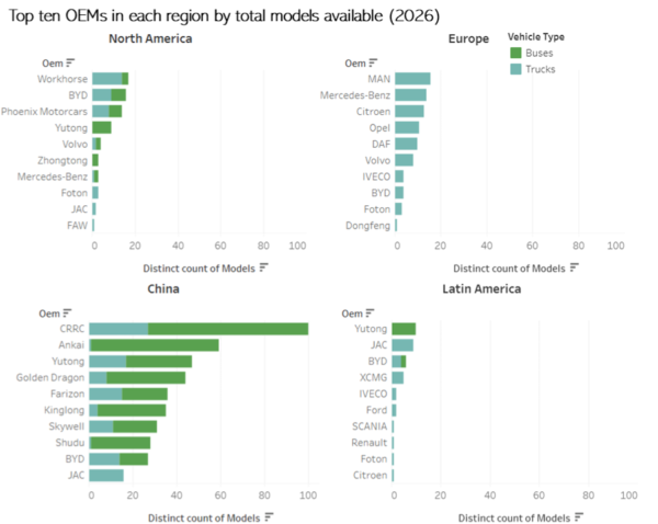 Top ten OEMs in each region by total models available (2026)