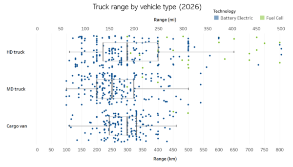 Despite these regional differences, the long-term outlook remains positive. Competition among remaining OEMs is intensifying, driving cost down and motivating advances in range, charging speed, durability, and towing capability. Range data in particular reveals a critical insight: technology is no longer the limiting factor for many commercial applications.