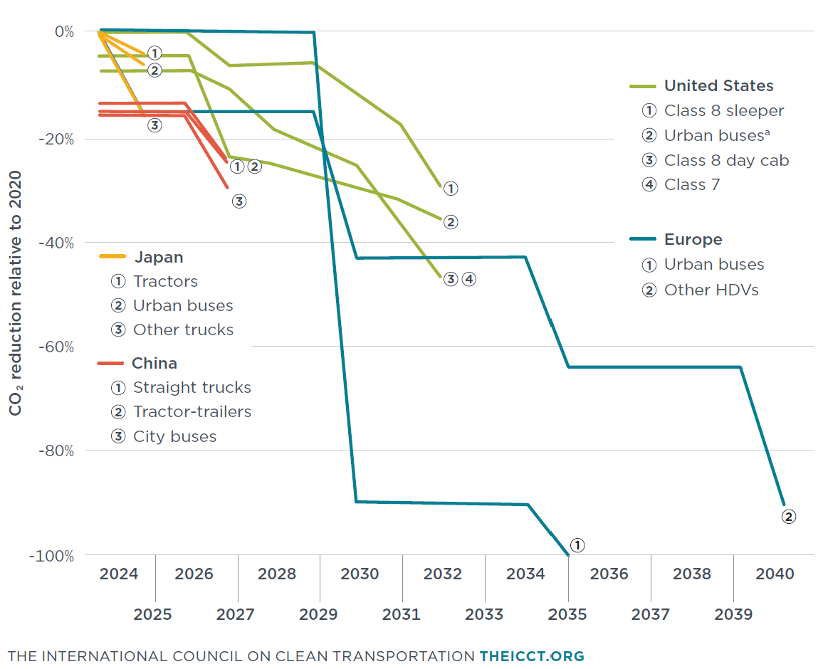 The United States Environmental Protection Agency’s (U.S. EPA) Phase 3 GHG standards (covering model years 2027–2032) sets progressively tighter CO₂ limits for trucks. However, the policy environment is unsettled as the Trump administration is actively seeking to roll back these rules and the legal foundation for regulating greenhouse gases, creating major uncertainty and backtracking years of progress.