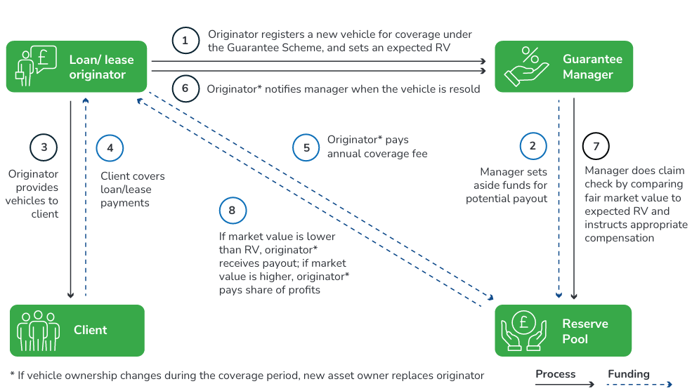 Residual value guarantees (RVGs) are a proposed solution to mitigate potential losses for financiers if actual resale values end up being lower than the estimated RVs. By doing so, RVGs can encourage higher RV setting, and thus more affordable financing products. RVGs have gained support from cross-industry stakeholders as a promising mechanism to scale up investments in BETs. By mitigating RV risk, a RVG can reduce lease costs and increase access to finance, stimulating early demand and accelerating market maturity by 5–8 years. The following figure illustrates the technical set up of an RVG, but for a deep dive into the topic see the whitepaper linked here.