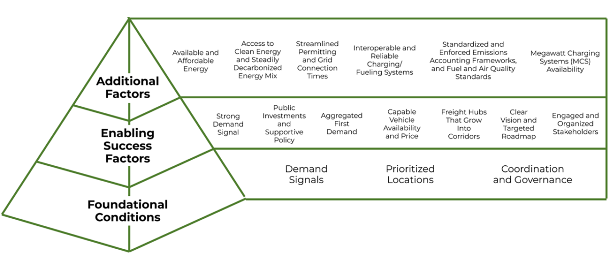 Building out the clean power and charging network of the future requires unprecedented collaboration across sectors. Beginning with ports and freight hubs as early targets for development, the network can be connected along key routes and highways to boost operational capabilities. Corridors, as the next phase, are essential for enabling longer trips without requiring oversized batteries, lowering costs while extending the range of ZE-MHDVs. Establishing this network requires close coordination across transportation and energy sectors, often spanning local and national borders. Governments, investors, grid operators, utilities, fleets, and communities must work together to deliver these complex, multi-year projects to achieve utilization and profitability. To meet the Global MOU’s 2030 milestones and achieve full transition by 2040, action must begin now. The figure below highlights the foundational aspects of establishing an ecosystem of enabling factors to allow corridor development to thrive.