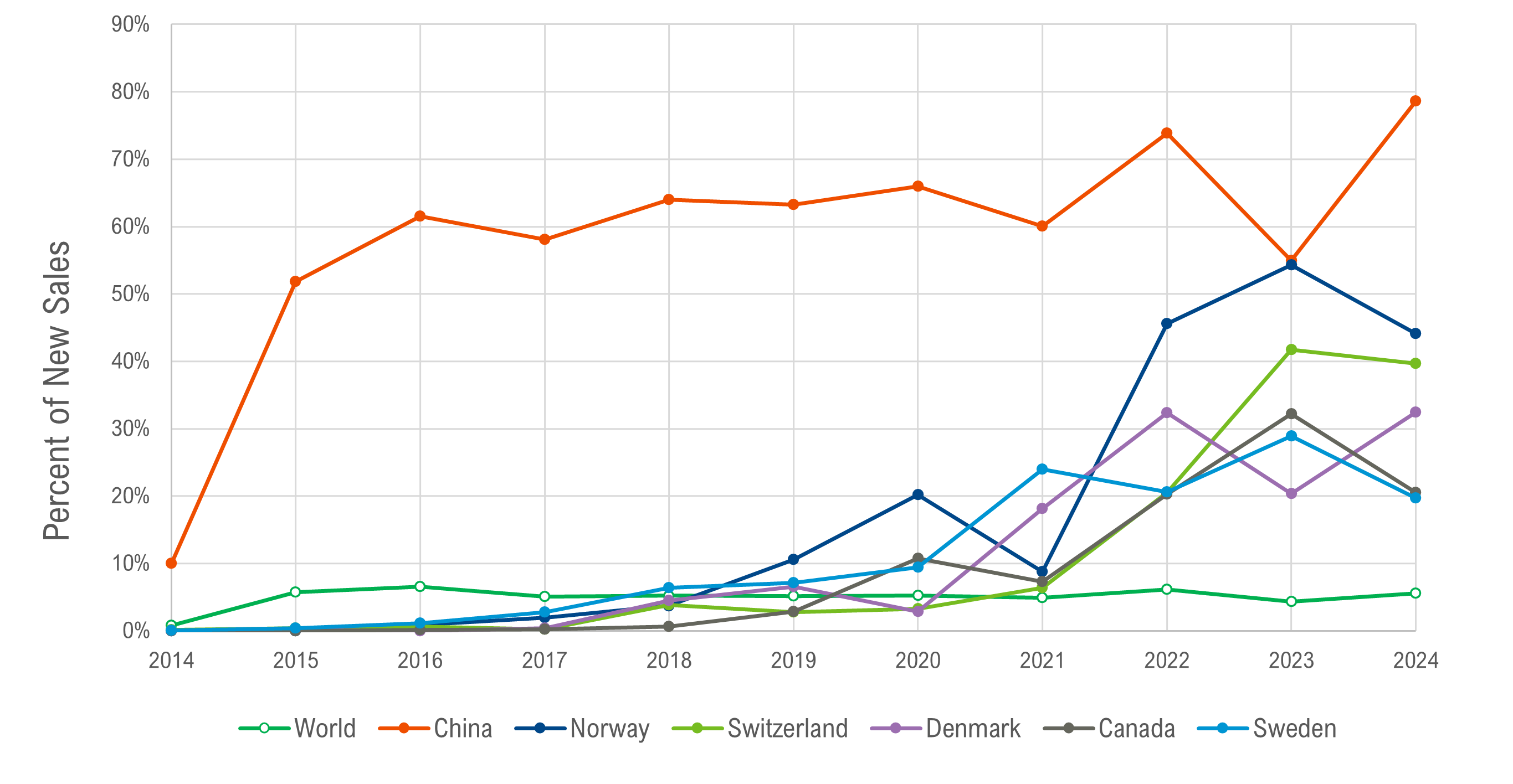 Since a brief slowdown in 2021, sales of zero-emission trucks have been making steady gains year over year. In 2024 approximately 107,800 units were sold in markets across the world, accounting for approximately 2% of all truck sales. Of these sales, about 81,000 were heavy-duty trucks, representing a doubling year-over year. While the sales concentrated in China, with an annual ZET sales share of 4.8%, noteworthy gains were observed in several European countries as well. In Switzerland, Norway, Denmark, and Sweden, where winter temperatures routinely drop below freezing, sales shares topped 7%. These results don’t just challenge old assumptions—they dismantle them, proving that zero-emission trucks can deliver in any climate.