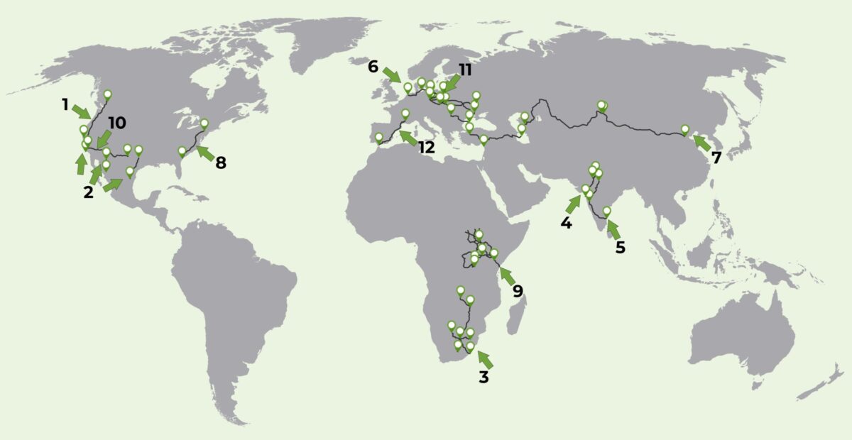 Over the last year the Global Green Road Corridors (GGRC) initiative expanded its scope by adding four new corridors to its portfolio of support: Africa’s Northern Corridor, the U.S. I-10 Corridor, the Germany–Poland Corridor, and the Mediterranean Corridor. This expansion enhances the initiative’s geographical diversity and strengthens its potential to foster global best practices. Below are the corridors visualized on a map, highlighting the cross-cutting geographies covered by this growing initiative.
