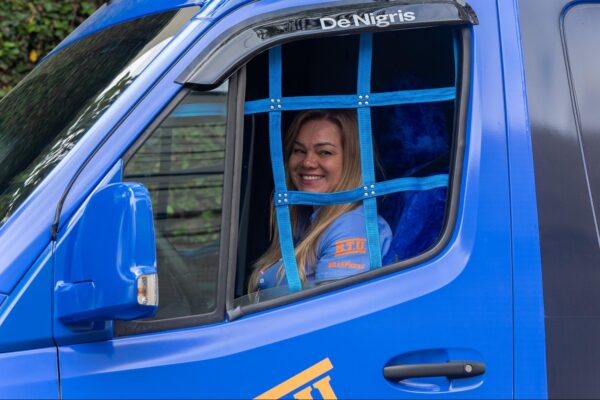 Vehículo de reparto con cero emisiones y conductora en São Paulo. Foto cortesía de Roosevelt Cássio/WRI Brasil.